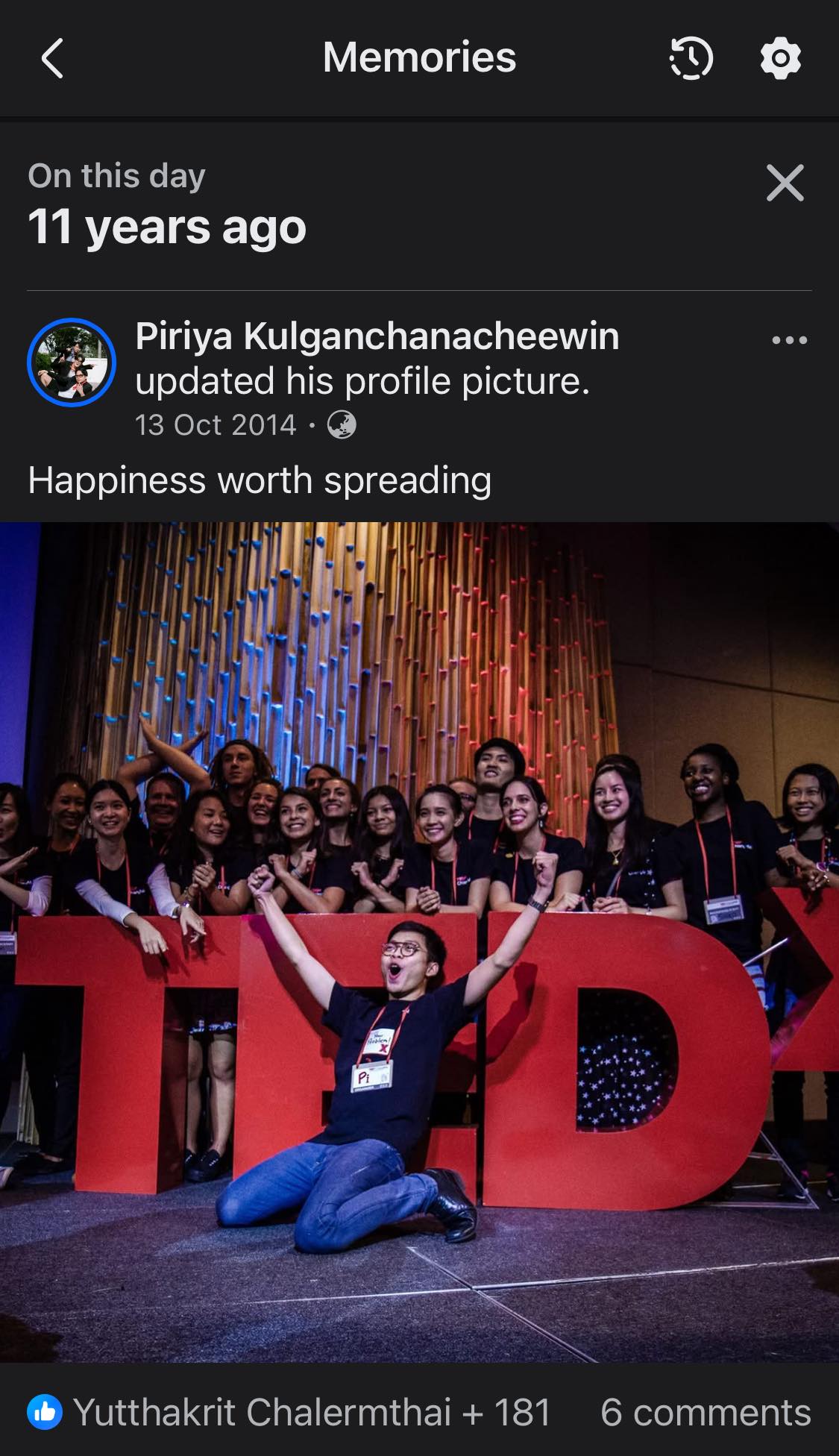 คุณพิเล่าว่า TEDx เริ่มจากกลุ่มอาสาสมัครเล็ก ๆ ที่ไม่มีใครรู้ว่ามันจะไปไกลแค่ไหน แต่ทุกคนเชื่อในสิ่งเดียวกัน เชื่อว่า “ความคิดดี ๆ เปลี่ยนโลกได้” นำมาสู่ ‘กัลยาณมิตร’ ดี ๆ ที่ทำให้เกิดงานดี ๆ เช่นเดียวกัน ไม่เถียงเลยกับประโยคที่ว่า “คุณคือค่าเฉลี่ยของคนที่คุณสนิทที่สุด 5 คน” การได้ทำ TEDx มาตลอดสิบปีก็นำมาซึ่งแวดล้อมดี ๆ เช่นกัน