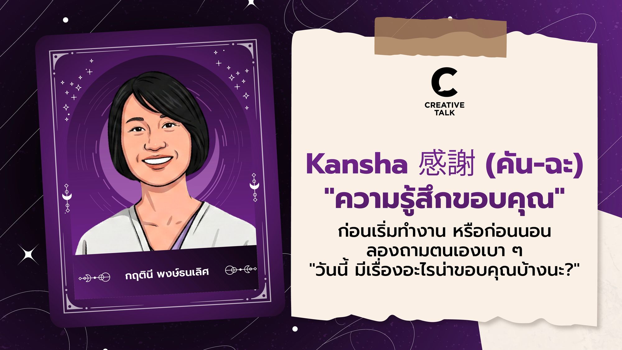 67. Kansha 感謝 (คัน-ฉะ) หรือ "ความรู้สึกขอบคุณ" ก่อนเริ่มทำงาน หรือก่อนนอน ลองถามตนเองเบา ๆ "วันนี้ มีเรื่องอะไรน่าขอบคุณบ้างนะ?" สิ่งนั้นอาจเป็นสิ่งของ สถานที่ โอกาส บุคคลรอบ ๆ ไม่ต้องฝืนหรือเค้น คิดออกก็ดี คิดไม่ออก ก็ไม่เป็นไร หากนึกออกได้ อารมณ์ ความรู้สึกในการทำงาน จะเปลี่ยนไปในทางที่ดีมาก