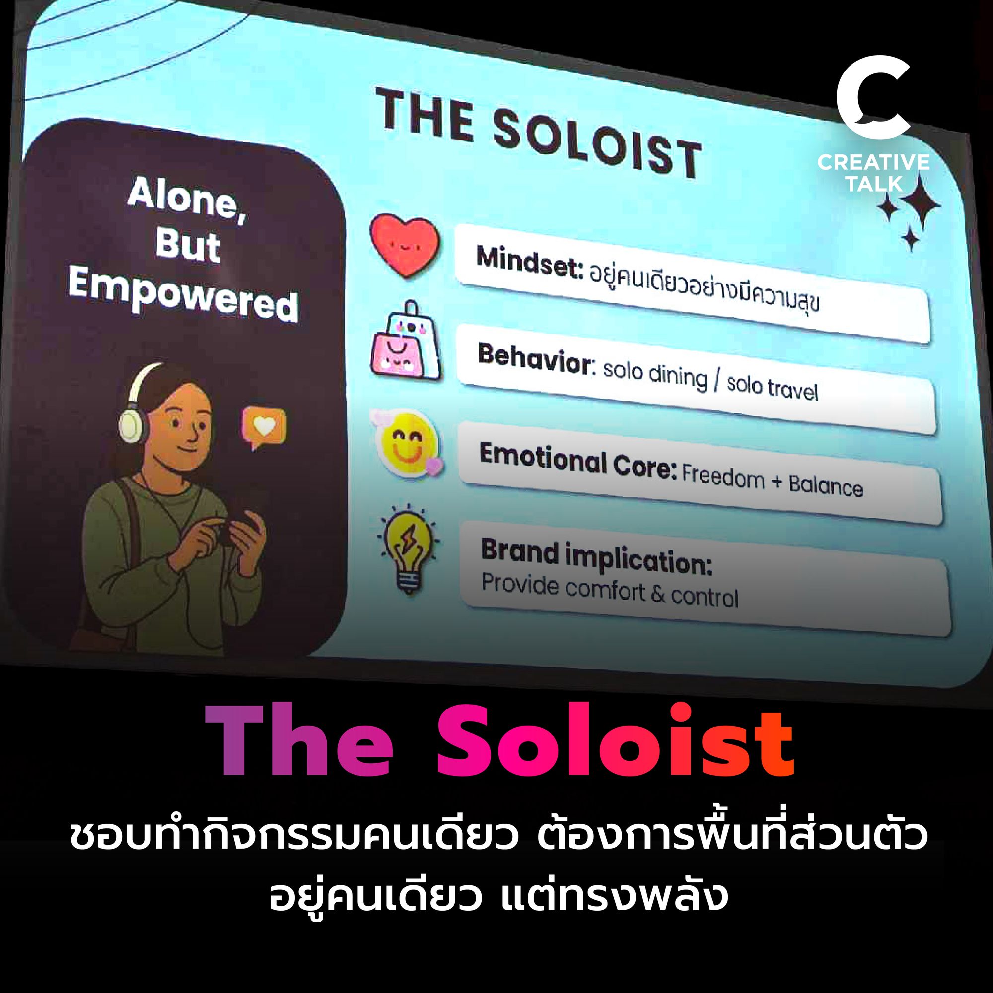 กลุ่มผู้บริโภคที่มีสถานะโสด ซึ่งมีอยู่ 25% ถือเป็น 1 ใน 4 ของประเทศ และคนที่อาศัยอยู่คนเดียวเพิ่มขึ้นทุกปี สิ่งที่น่าสนใจของคนกลุ่มนี้คือมีการเติบโตค่อนข้างสูง โดย 37% ของคนไทย มักชอบทำกิจกรรมคนเดียวมากกว่าไปเป็นกลุ่ม ดังนั้นคนกลุ่มนี้มักจะต้องการพื้นที่ส่วนตัว และเป็นพื้นที่ให้กำลังใจกับคนกลุ่มนี้ได้