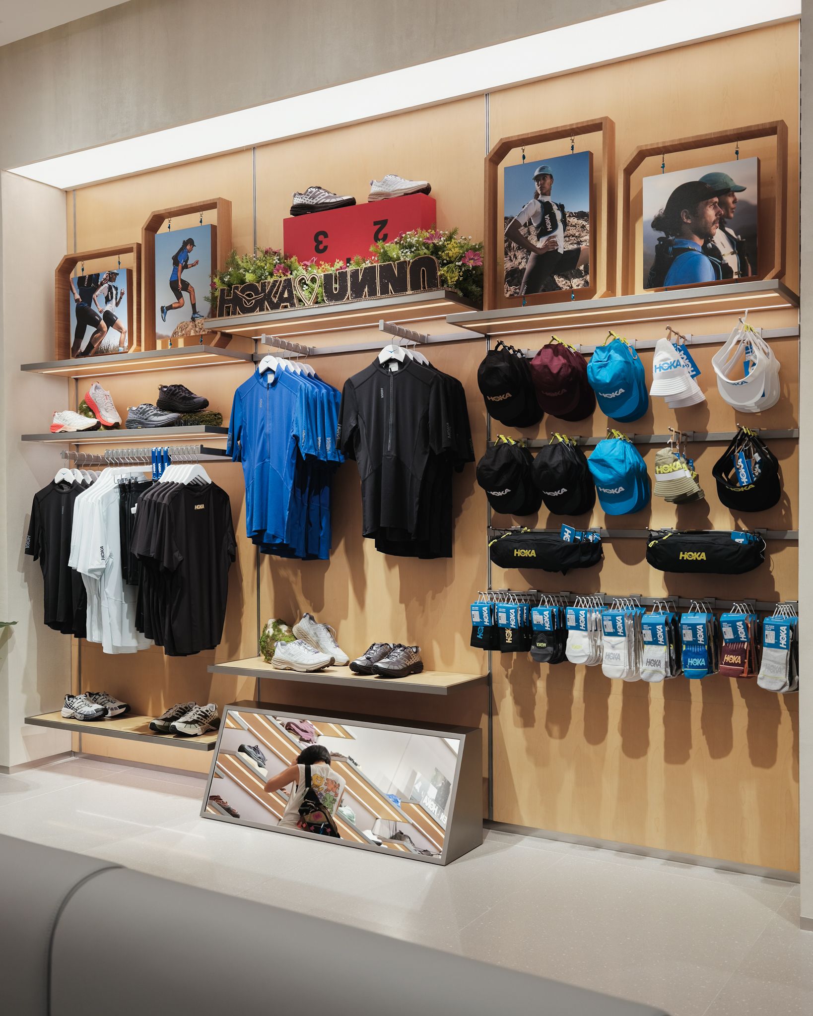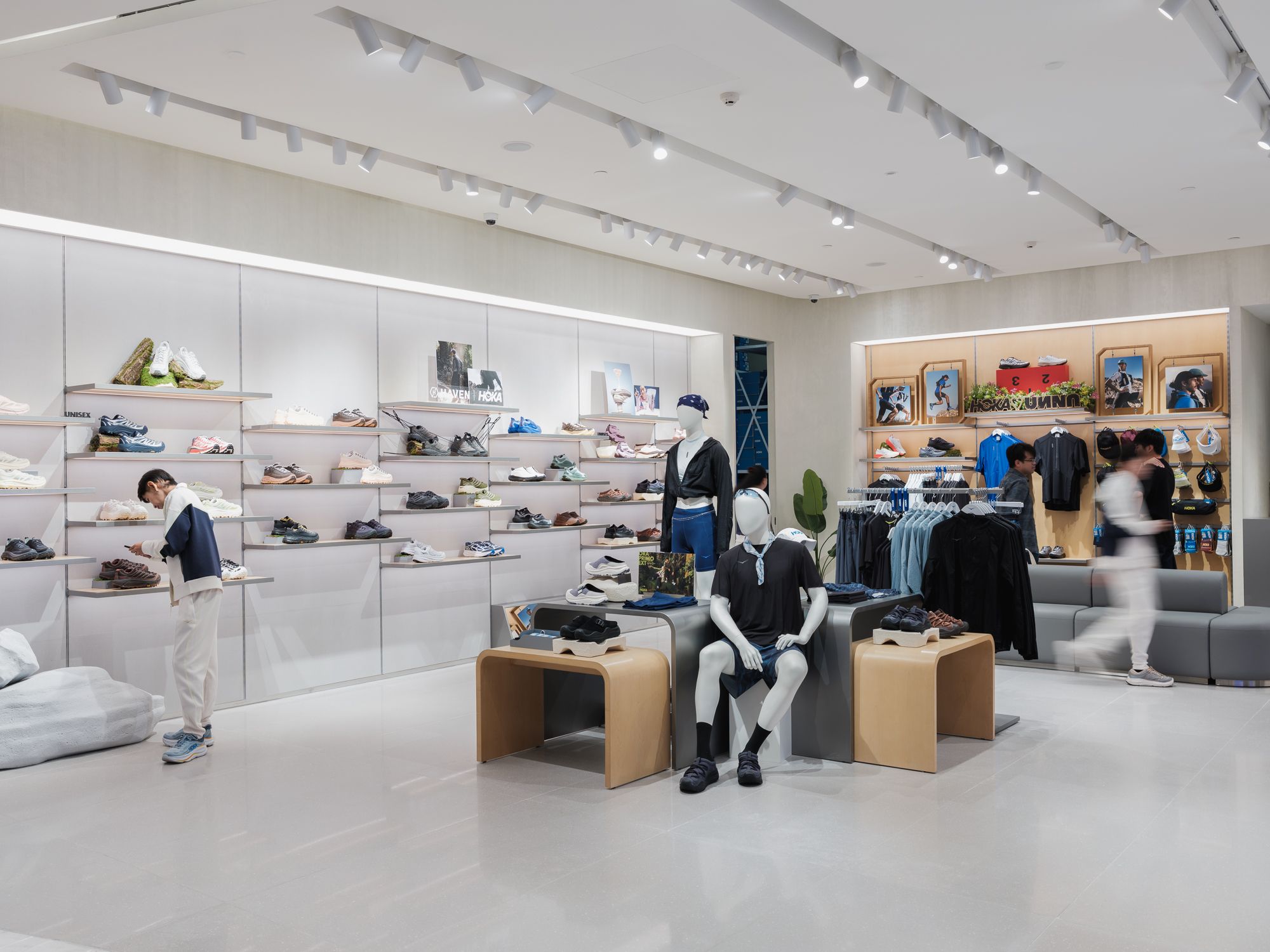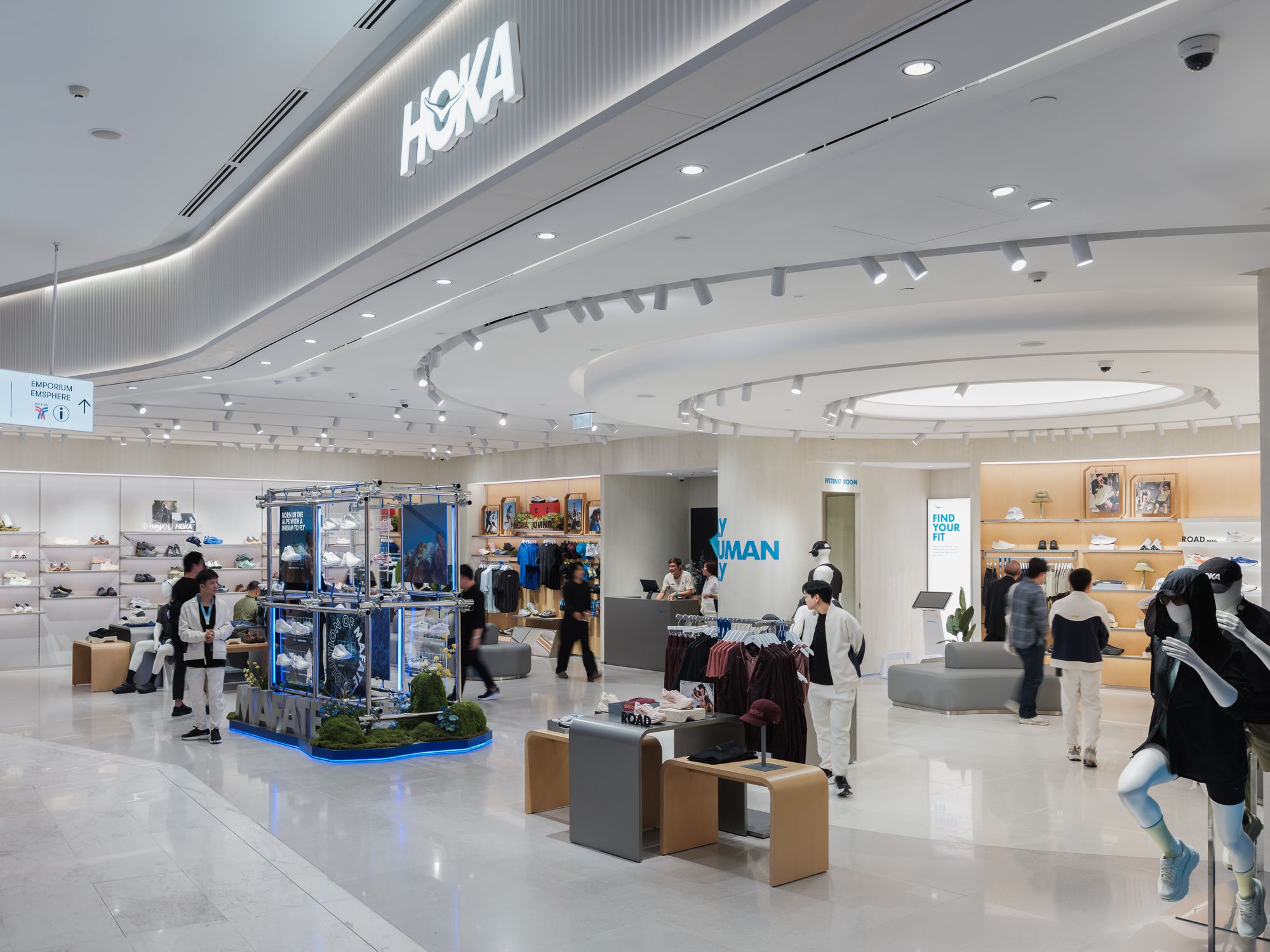 ภายในร้าน HOKA สาขา EmQuartier ได้รับการออกแบบให้สะท้อนตัวตนของคนรุ่นใหม่ที่เชื่อในพลังของ “การเคลื่อนไหวที่ไร้ขีดจำกัด” โดยเชื่อมโยงแนวคิด “Performance Meets Lifestyle”