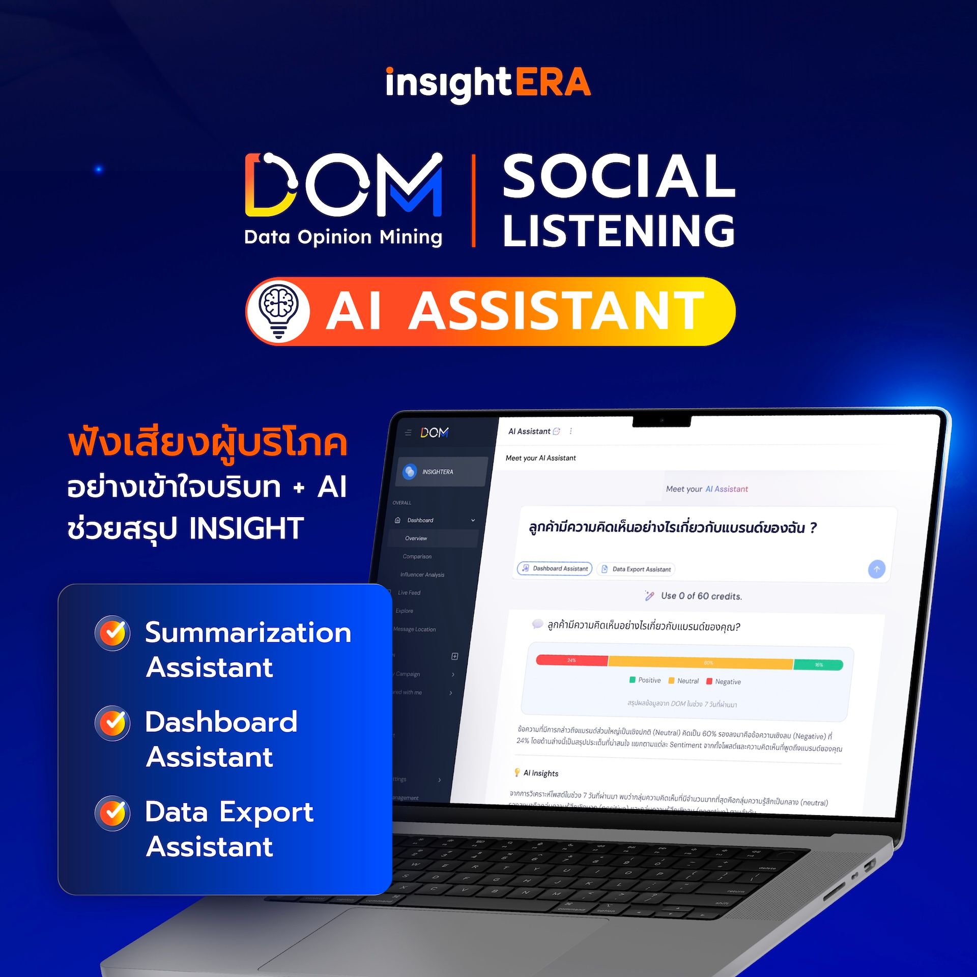 ขณะเดียวกัน InsightERA ยังพัฒนาเครื่องมือ AI Assistant ผ่าน DOM แพลตฟอร์ม Social Listening & Social Analytics ที่พัฒนามาอย่างต่อเนื่องและลึกซึ้งตลอดหลายปี เพื่อให้แบรนด์ไทยเข้าใจเสียงผู้บริโภคอย่างแท้จริง ทั้งในเชิงปริมาณ อารมณ์ และบริบทของธุรกิจ โดยผู้ช่วยอัจฉริยะจะช่วยให้แบรนด์สามารถวิเคราะห์ความคิดเห็นและบทสนทนาของผู้บริโภคในโลกออนไลน์ได้ง่าย รวดเร็ว และตอบโจทย์มากกว่าที่เคย และยังสามารถให้คำแนะนำจาก Insight ที่ได้จากข้อมูลได้อย่างตรงจุด ตอบโจทย์ทั้งเรื่องความรวดเร็ว และความแม่นยำ ซึ่งเป็นหัวใจสำคัญในการพัฒนาแบรนด์ สื่อสาร และบริหารความเสี่ยงเชิงภาพลักษณ์ในยุคดิจิทัล