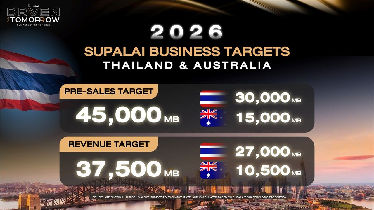 “ศุภาลัยตั้งเป้ายอดขายรวมในปี 2569 ทั้งในประเทศไทยและประเทศออสเตรเลียที่ 45,000 ล้านบาท* แบ่งเป็นเป้ายอดขายในประเทศไทย 30,000 ล้านบาท และเป้ายอดขายจากประเทศออสเตรเลีย 15,000 ล้านบาท”