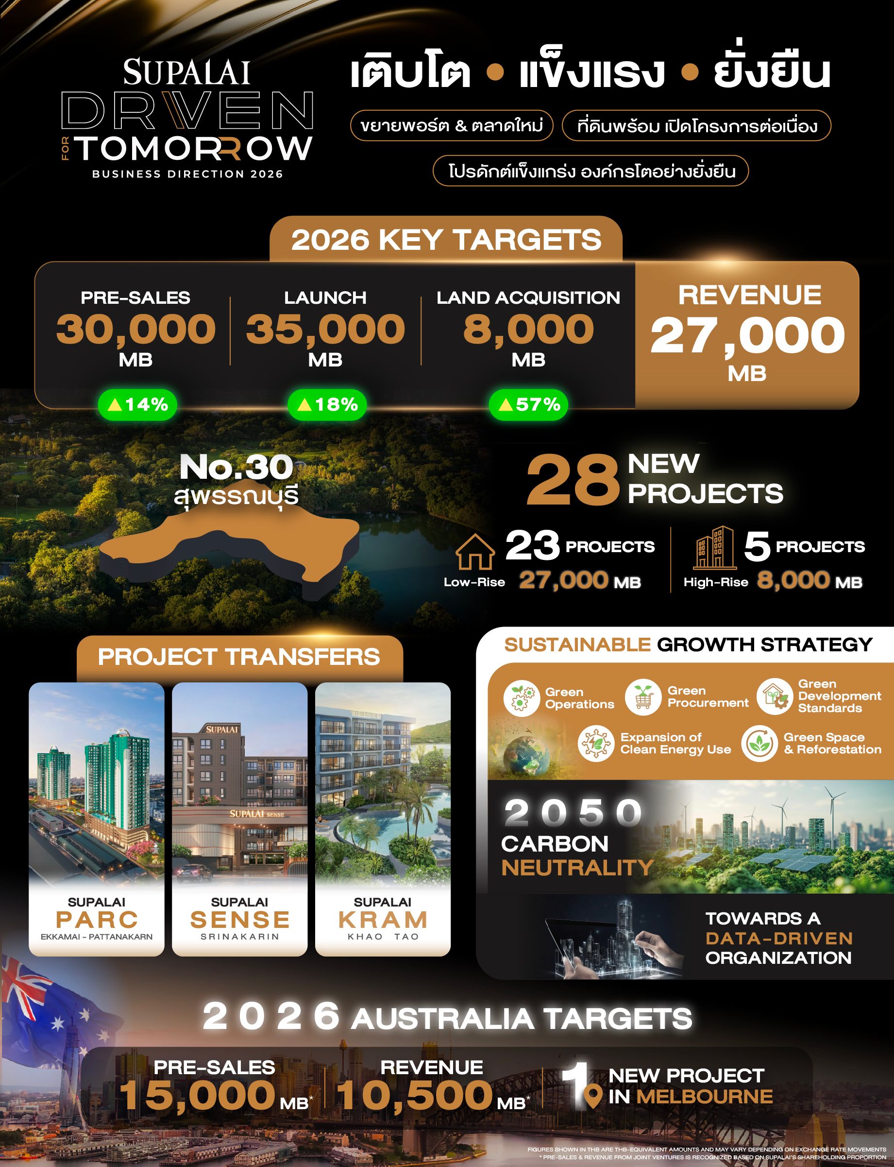 พร้อมแผนเปิดโครงการใหม่ 28 โครงการ มูลค่า 35,000 ล้านบาท พร้อมลุยสุพรรณบุรีและเกาะสมุย เดินหน้าสร้างฐานรายได้ให้สมดุลมากขึ้นผ่านธุรกิจต่างประเทศ โดยเฉพาะตลาดอสังหาฯ ออสเตรเลียที่ปี 2568 เติบโตกว่า 370% พร้อมรุกธุรกิจคลังสินค้าให้เช่า ควบคู่ยกระดับองค์กรด้วย Data Driven และกรอบ Sustainability Driven มุ่งสู่ Carbon Neutrality ปี 2050