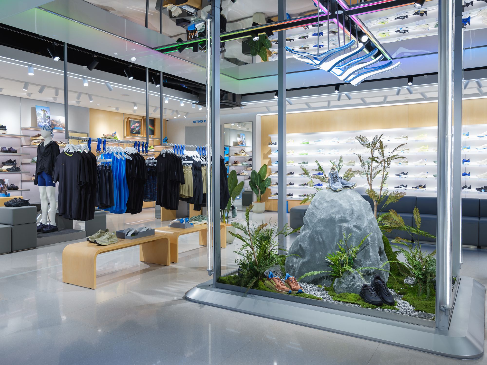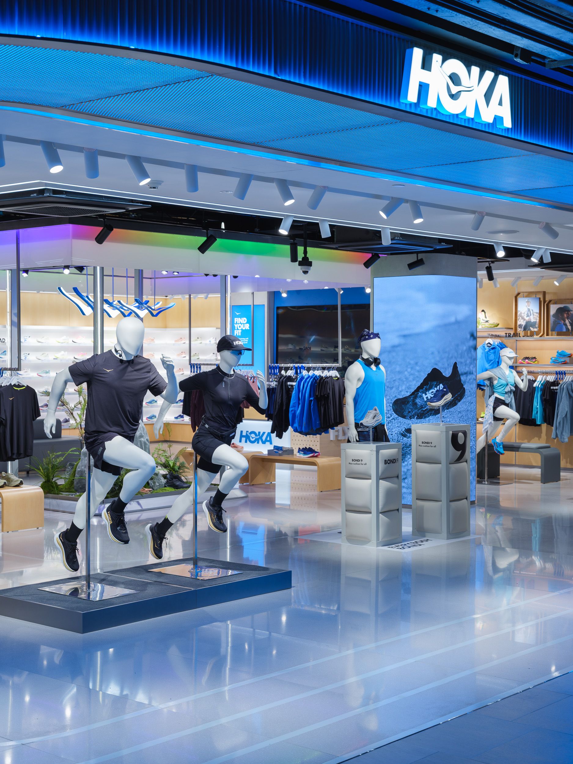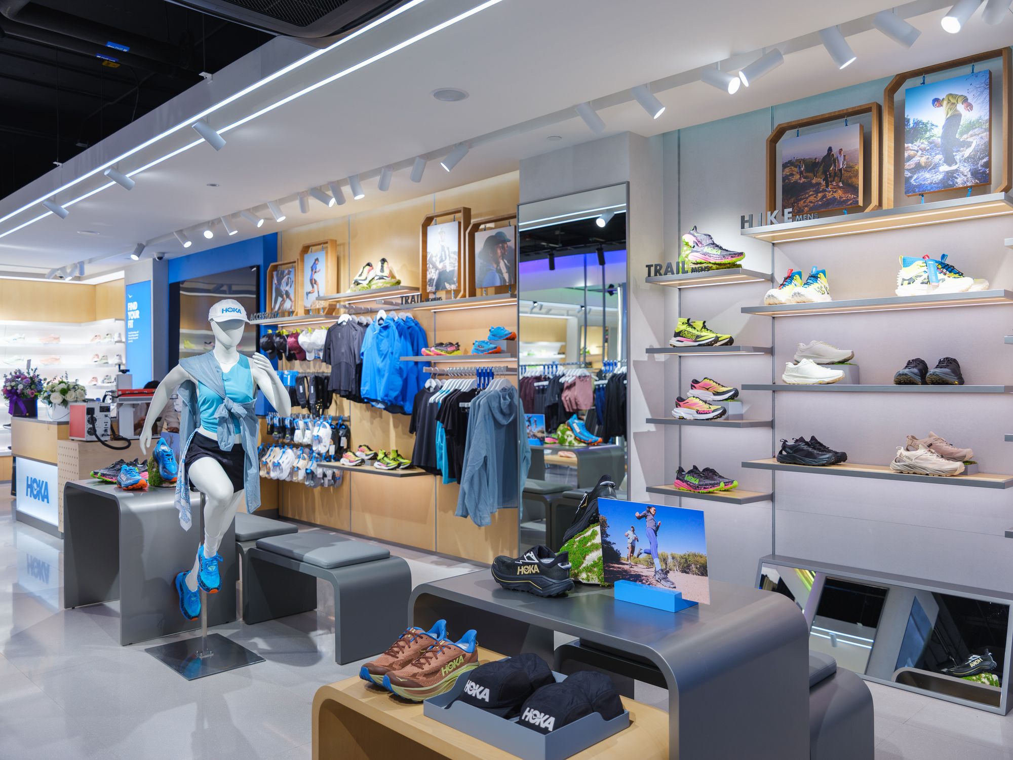 - สาขา EmQuartier - โดย Concept Store โดยสาขา EmQuartier เป็น “Concept Store” แห่งแรกในเอเชียตะวันออกเฉียงใต้ได้รับการออกแบบเชื่อมโยงแนวคิด “Performance Meets Lifestyle” เข้ากับดีไซน์ร้านผ่านโทนวัสดุธรรมชาติ และเส้นสายที่ให้ความรู้สึกพริ้วไหว มีชีวิตชีวา และ สาขานี้ยังมีบทบาทสำคัญในฐานะ Lifestyle Hub ที่นำเสนอทั้งสินค้า แรงบันดาลใจ และวัฒนธรรมแห่งการเคลื่อนไหวในแบบฉบับของ HOKA ไว้ในที่เดียวซึ่งสะท้อนจุดมุ่งหมายของแบรนด์ในการเชื่อมต่อกับผู้บริโภคยุคใหม่และเข้าถึงกลุ่มคน Urban Lifestyle มากขึ้น