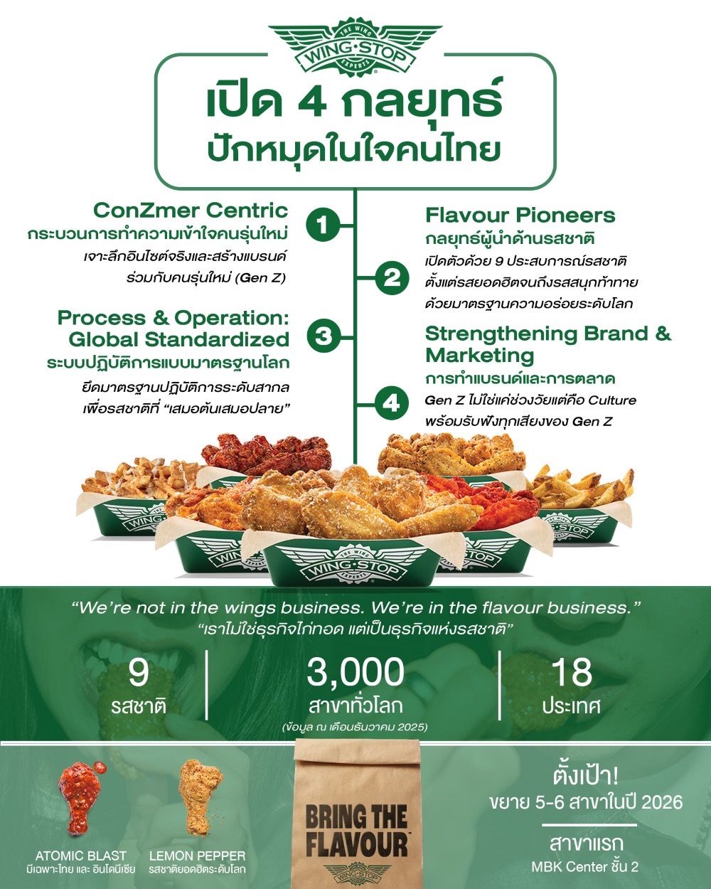 พร้อมนำประสบการณ์ด้านรสชาติในแบบฉบับของ Wingstop กว่า 9 รสมาเสิร์ฟให้ผู้บริโภคชาวไทยได้สัมผัสเป็นครั้งแรกตั้งแต่วันที่ 13 ธันวาคม 2568 เป็นต้นไป เปิดให้บริการทุกวันตั้งแต่เวลา 10.00–02.00 น. พร้อมเปิดกลยุทธ์เดินเกมเต็มกำลัง โดยตั้งเป้าเป็นแบรนด์ Top of Mind ของคนรุ่นใหม่ หรือ Gen Z ในปัจจุบัน พร้อมวางแผนขยายเพิ่ม 5-6 สาขาภายในปี 2026 โดยมี “เนม-ปราการ ไรวา” ที่รู้จักกันในฐานะนักร้องนำวง Getsunova ขึ้นแท่นผู้บริหารธุรกิจเต็มตัวครั้งแรก
